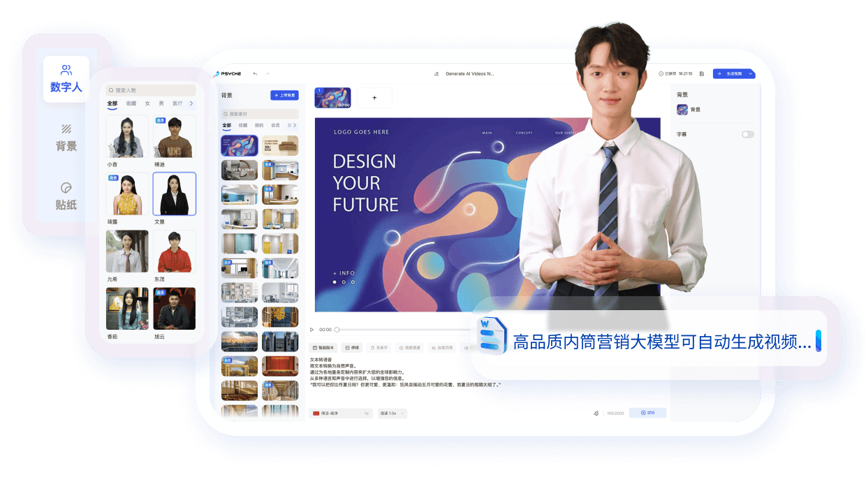 产品内置高品质的AI数字人形象和通用的营销内容制作模版,输入主题可通过大模型一键撰写视频文案,并自动生成短视频